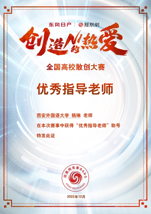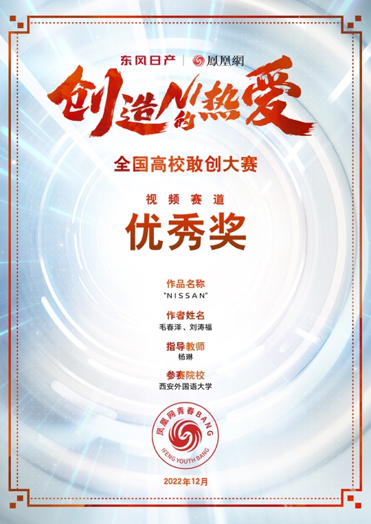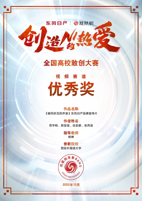 近日,东风日产携手凤凰网举办的“创造NI的热爱”东风日产全国高校敢创大赛线上终评会顺利举行,我院四支团队的视频作品取得佳绩,获得优秀奖,指导教师杨琳获评优秀指导老师。