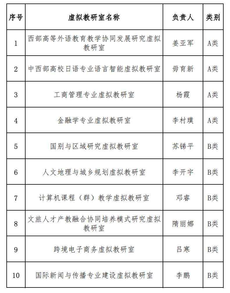 为贯彻落实立德树人根本任务,全面提高教师教书育人水平,推进信息化时代新型基层教组织建设,增强教师将现代信息技术与教育教学深度融合的能力,根据学校《关于开展第二批虚拟教研室试点建设工作的通知》,经教研室申报、学院审核、专家评审、本科教学工作委员会审定、学校公示等程序,批准10个项目为第二批校级虚拟教研室试点建设项目。其中我院教师李鹏获批“国际新闻与传播专业建设虚拟教研室”项目。