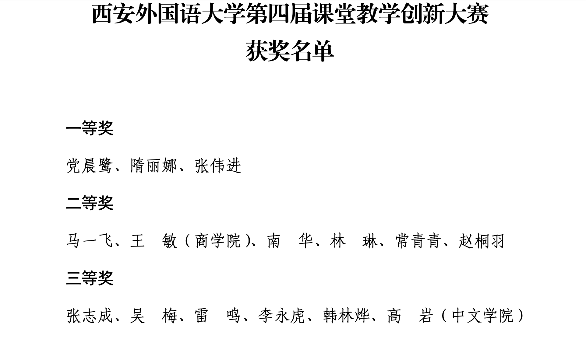根据学校《关于举办第四届课堂教学创新大赛的通知》(西外办发〔2022〕44号)要求,经个人报名、学院选拔推荐、专家打分评审等环节,评选党晨鹭等15名教师获得西安外国语大学第四届课堂教学创新大赛一、二、三等奖。其中我院教师赵桐羽荣获二等奖,教师张志成荣获三等奖。