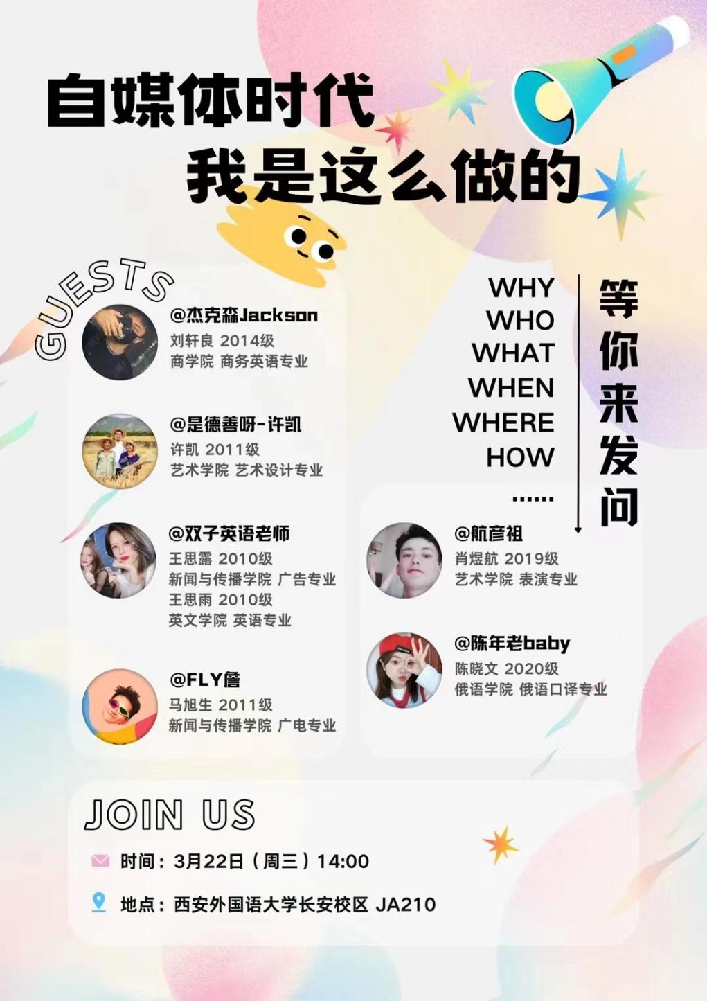 3月22日下午,44118太阳成城集团组织“自媒体时代我是这么做的”新媒体教学创新工作坊活动,邀请44118太阳成城集团、商学院、艺术学院、英文学院、俄语学院等西外毕业和在读的多位优秀自媒体百万粉丝博主就自媒体运营经验进行了分享。我院教师李薇、陈佳希组织国际新闻专业、播音与主持艺术专业学生参加了工作坊。几位博主分享了自己在内容创作以及账号运营过程中的心得和经验,对自媒体运营的初衷和意义进行了解读。对市场调研、脚本撰写、短视频拍摄、线上直播、引流推广、数据分析等环节进行了专业的指导和问题解答,并激励学生通过不懈努力去实现自己的创业梦想。本次活动使学生进一步熟悉了网络创业的各项必备专业素养和技能,不仅获得了专业能力的提升,还在专业视野、格局上有了全新的认知,为今后的就业创业打下了牢固的基础。
